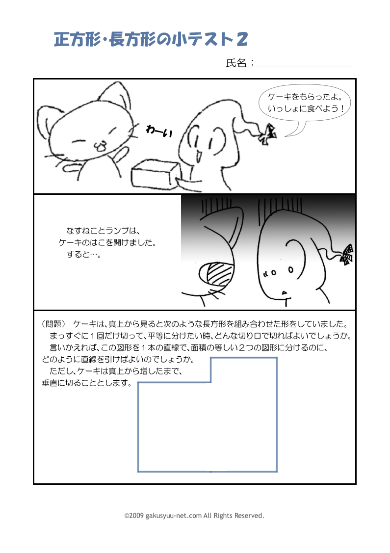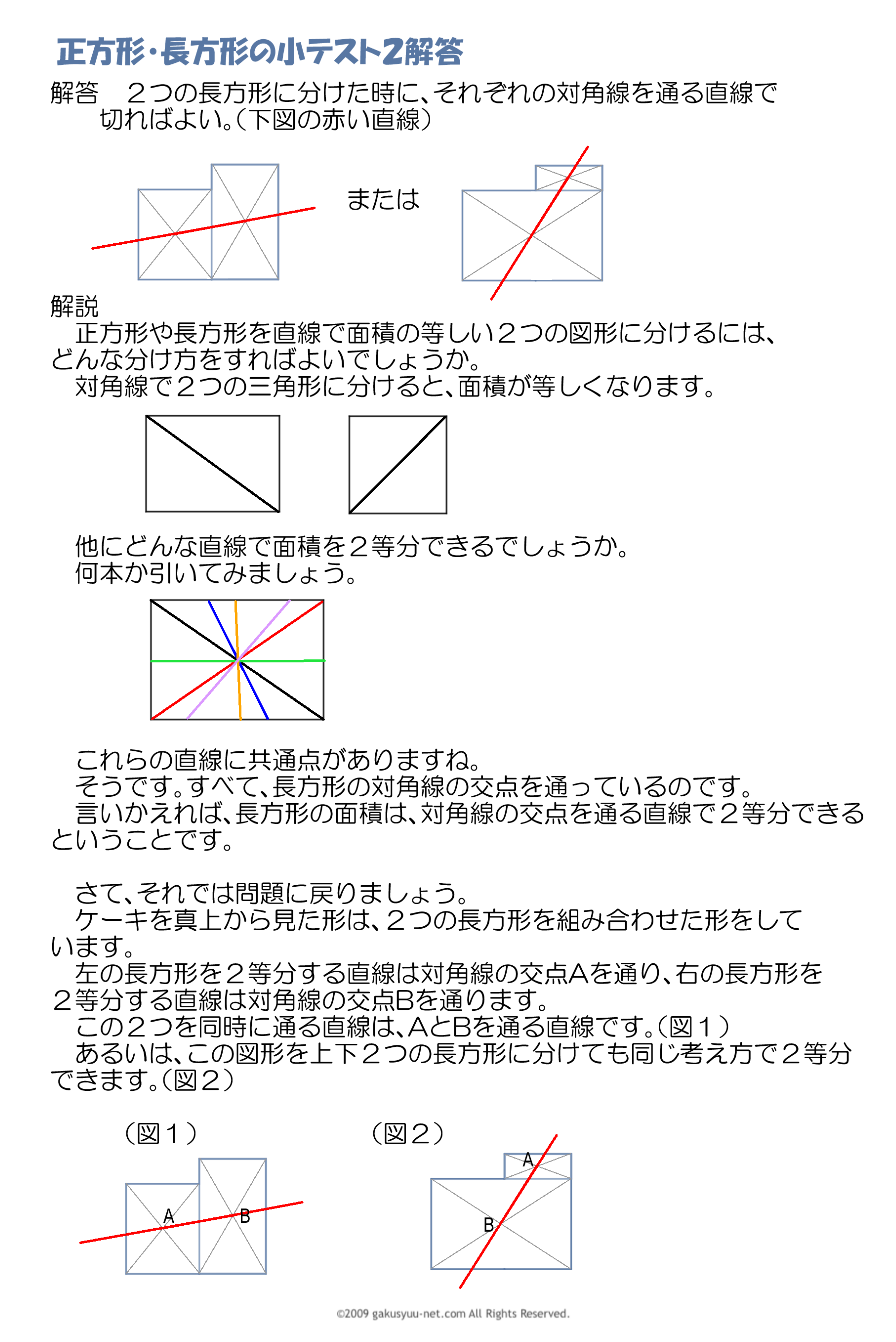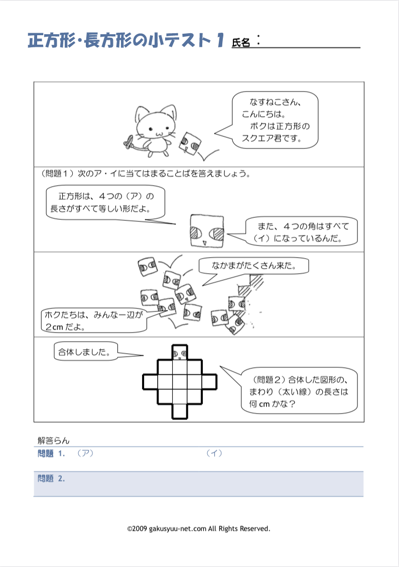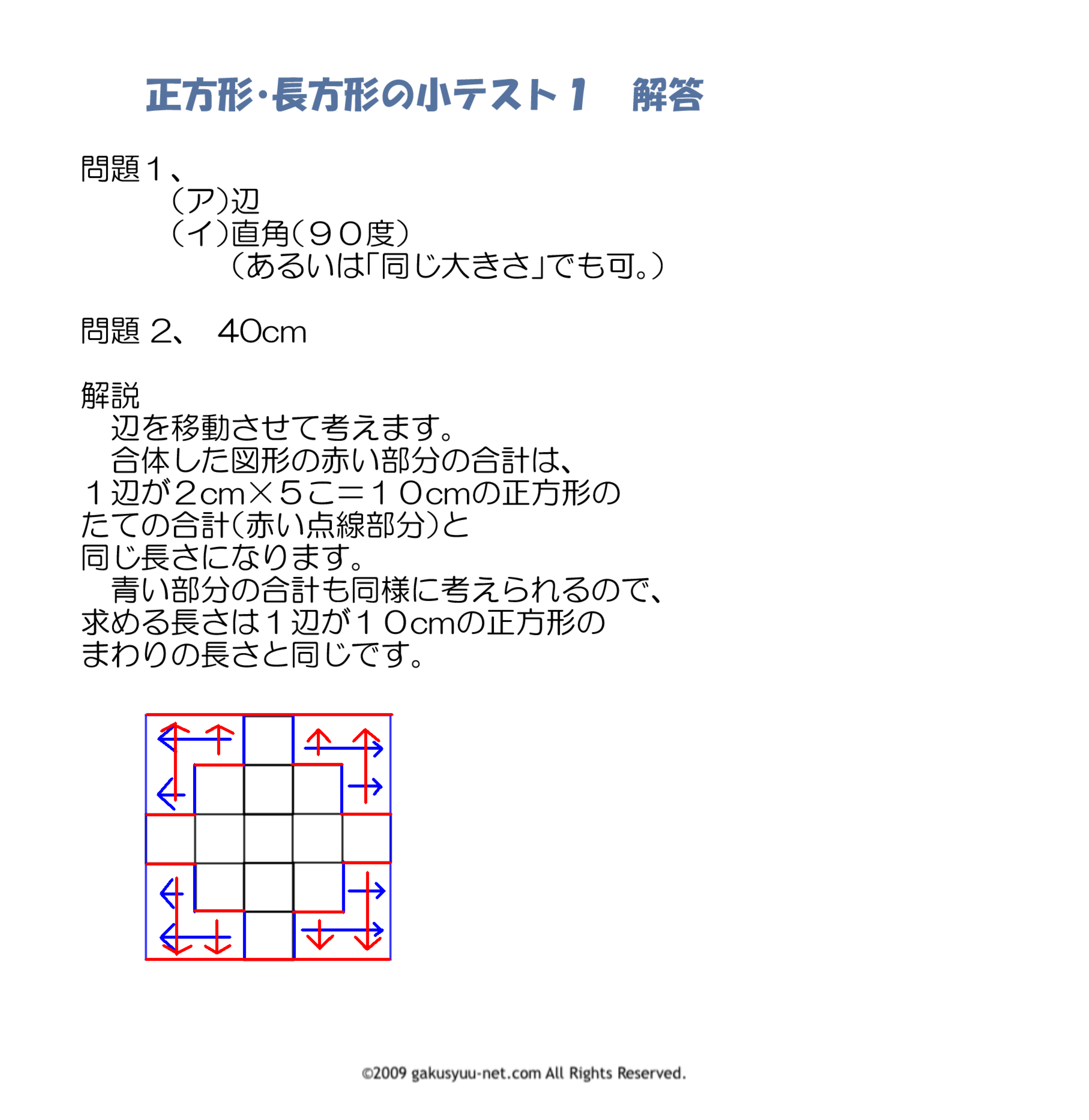 正方形・長方形の性質、面積 解説 正方形・長方形の性質解説 正方形・長方形の面積 小テスト 正方形・長方形の小テスト1 正方形・長方形の小テスト1の解答 正方形・長方形の小テスト2 正方形・長方形の小テスト2の解説 正方形・長方形の小テスト3 正方形・長方形の小テスト3