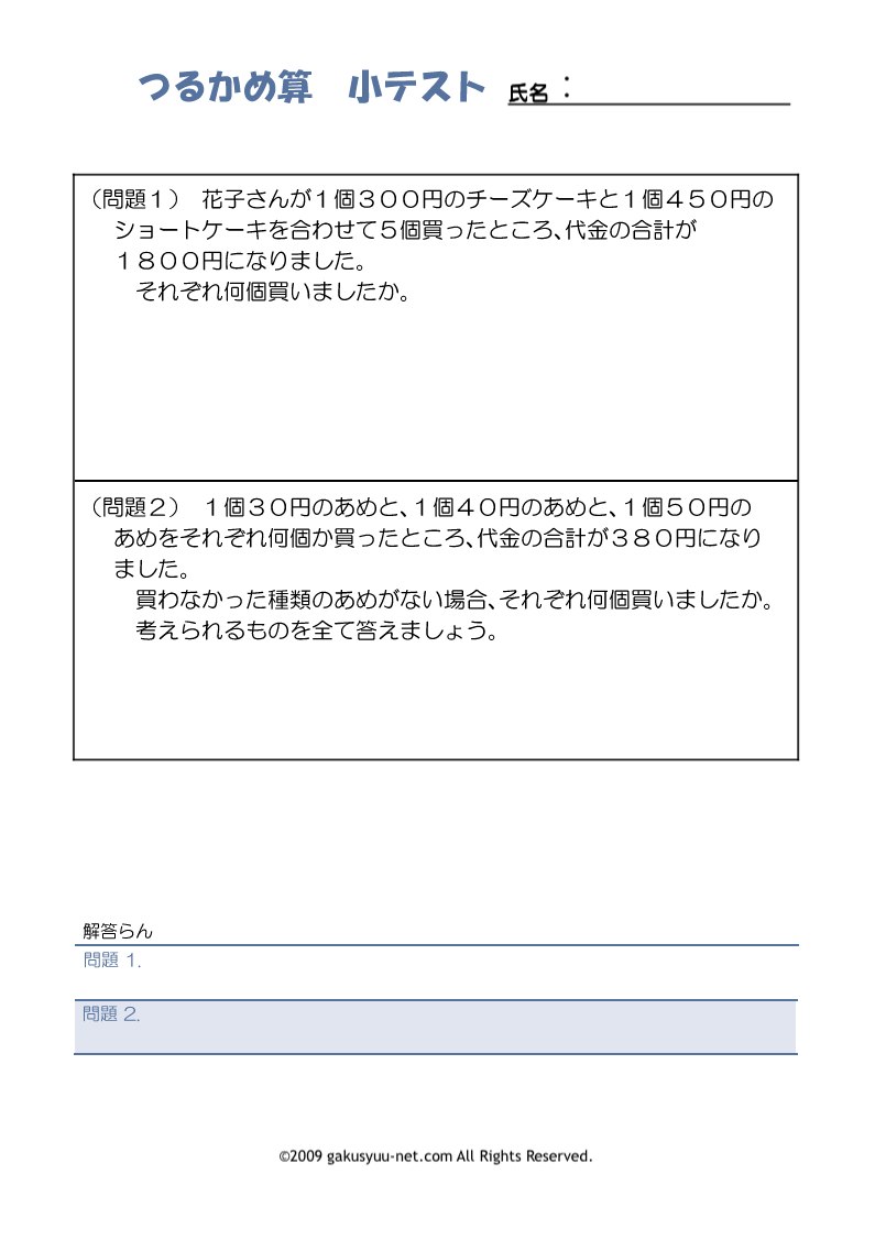 つるかめ算の小テスト解答